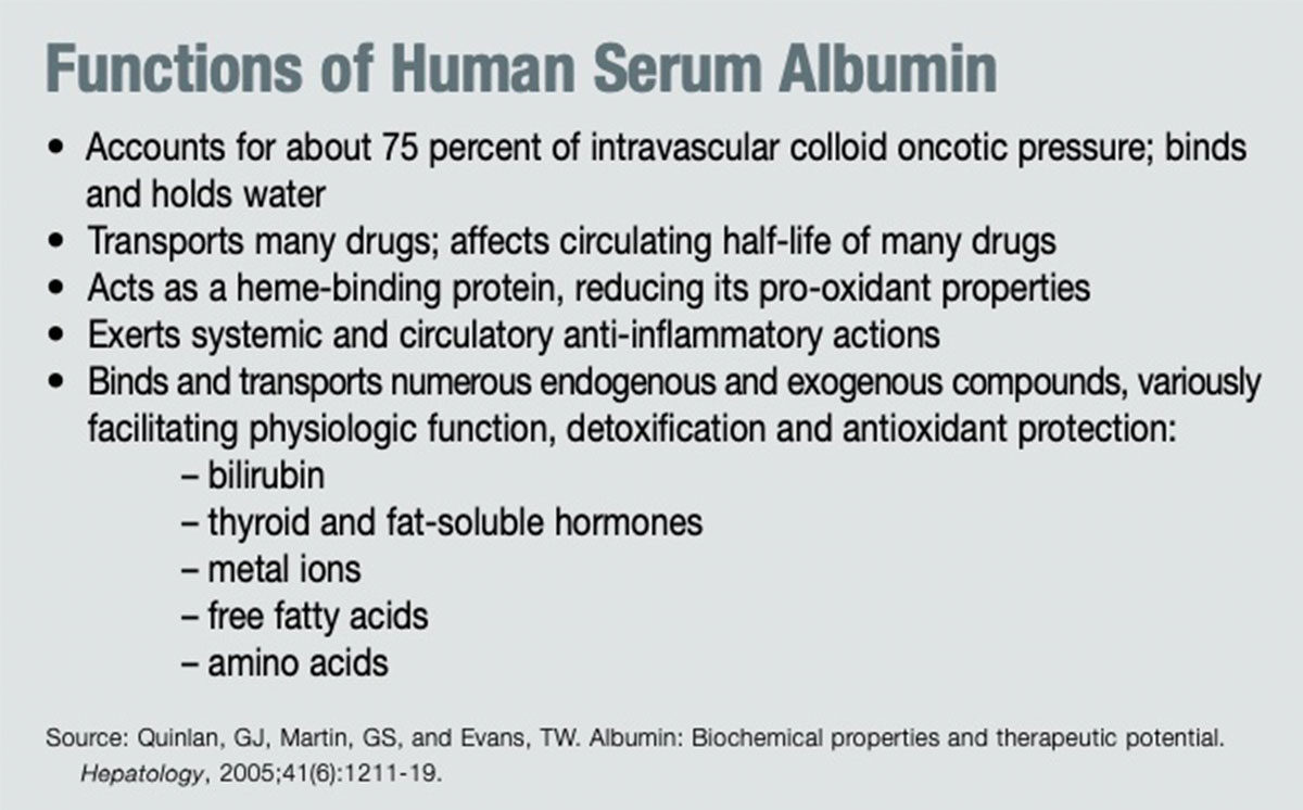 Reported findings from Dr. Boldt’s study perhaps should also have aroused the suspicions of anyone familiar with the major physiological functions of human albumin (see the table, Functions of Human Serum Albumin) or numerous earlier studies clearly associating the use of earlier-generation HES products with impaired hemostasis and excessive blood loss in typically hypothermic, hemodiluted and heparinized patients undergoing cardiac surgery.3,4 “Highvolume priming of the CPB circuit with a modern balanced HES solution resulted in reduced inflammation, less endothelial damage, and fewer alterations in renal tubular integrity compared with an albumin-based priming,” Dr. Boldt and hisfive co-authors concluded. “Coagulation including platelet function was better preserved with high-dose balanced HES CPB priming compared with albuminbased CPB priming.”