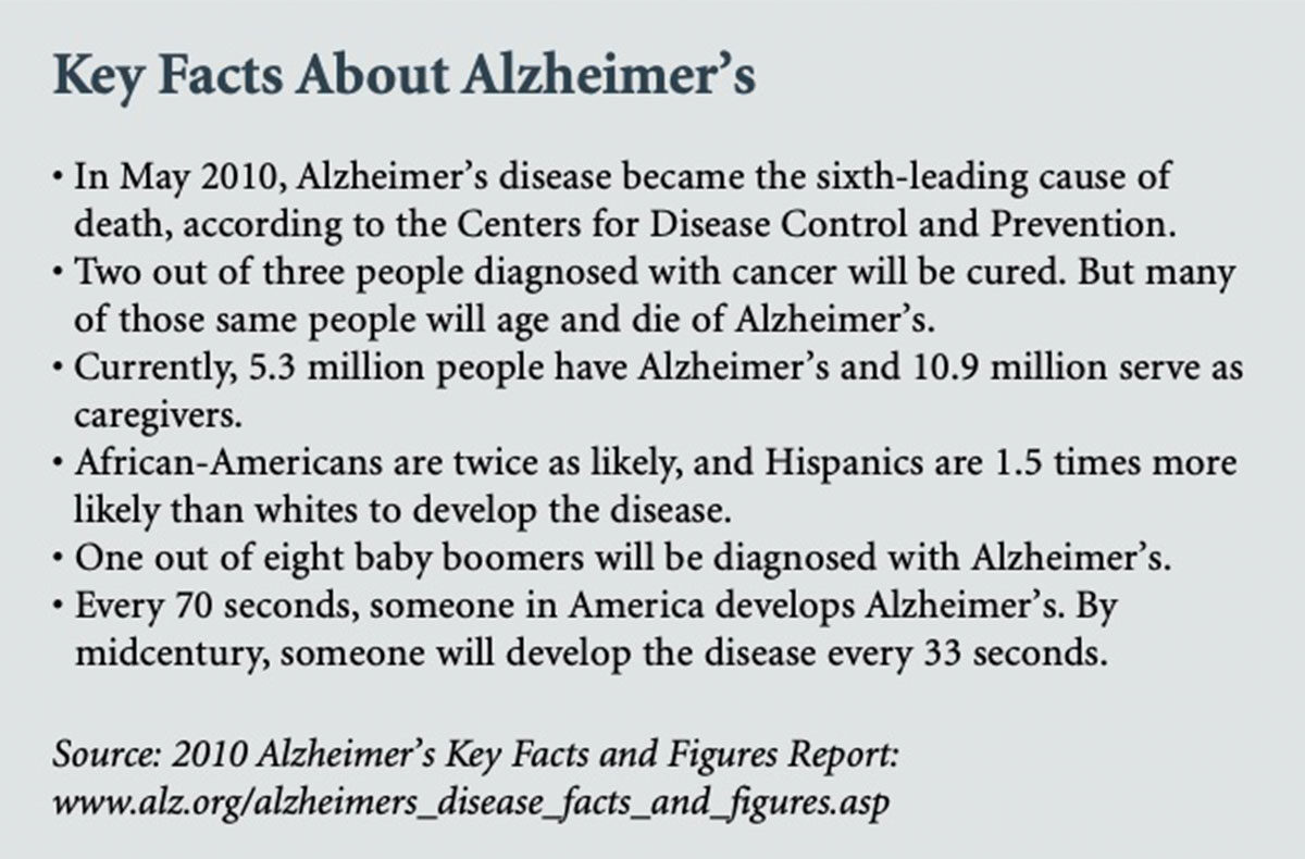 Early-onset Alzheimer’s, also called familial Alzheimer’s disease, is a rare, inherited form of Alzheimer’s that affects individuals younger than 65 years of age. According to the Mayo Foundation for Medical Education and Research, early-onset Alzheimer’s disease accounts for only 5 to 10 percent of all cases of Alzheimer’s disease. Those who contract the disease early in life almost always have a family history of Alzheimer’s. If even one parent has early-onset Alzheimer’s, offspring have a 50 percent chance of inheriting the disease. If both parents have the disease, children will eventually suffer from it too. But statistics always have exceptions; in Susan’s case, there is no family history of Alzheimer’s at all. She suffers from a variant form of the disease for which there is still little scientific data.