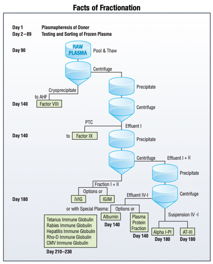 This may sound simple, but it is more complicated with IG. When compared to most other drug therapies, IG is high-cost, primarily because of the expense of plasma procurement, testing and fractionation. Fractionation — the months-long, arduous process of converting plasma into its three main commercial proteins: IG, factor and albumin (see Facts of Fractionation) — is only cost-effective if there is relatively equivalent demand for each of these products. When IG was first used to treat primary immune deficiency (PIDD) and autoimmune disorders (namely, idiopathic thrombocytopenic purpura or ITP), there was enough demand for each of the products. That changed when full-liter or total protein portfolio pull-through was reduced, caused first by the introduction of recombinant factor, which competed against fractionated plasma-derived factor, and followed by a decrease in albumin demand due to the release of a damaging and unfounded report. Without enough demand for factor and albumin, there was pressure to increase the cost of IG.