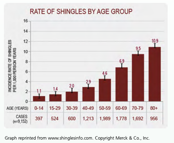 It is estimated that in the United States, one million cases of shingles occur every year, and an individual’s risk of getting shingles increases with age. (See the Rate of Shingles by Age Group graph.) Of those cases, almost half will occur in people 60 years of age or older. And, as the population ages, the number of cases of shingles is likely to increase.