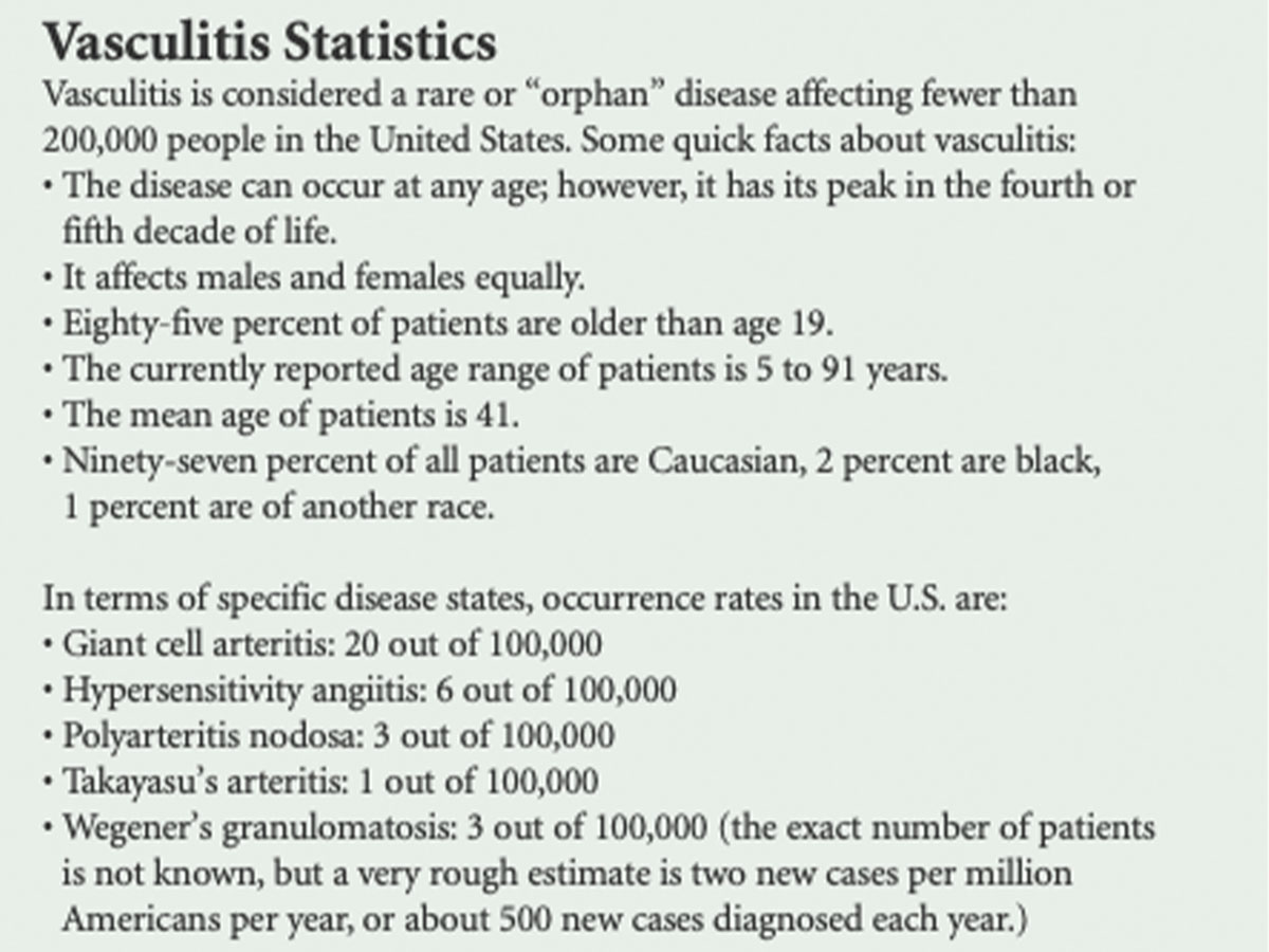 Vasculitis is an inflammation of the blood vessels that causes thickening, weakening, narrowing and scarring. There are many different types of vasculitis, and symptoms often mimic those of other diseases or disorders, which is why it can be so difficult to diagnose.