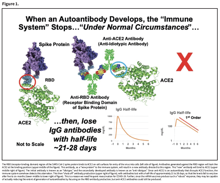 SARS-CoV-2 infects cells via binding to ACE2 on the surface of cells via the receptor-binding domain (RBD) region of the spike protein of the virus. Accordingly, we were the first to hypothesize that making antibodies to the RBD region (via vaccination or by infection) would, in turn, result in anti-idiotypic antibodies that would bind to ACE2.1 Further, we were concerned these antibodies could disrupt ACE2 function (regulation of inflammation and blood pressure), which could result in increased inflammation in patients and dysautonomia (dysregulation of blood pressure). We studied this and demonstrated it to be true: People infected with SARS-CoV-2 do make anti-ACE2 antibodies, and these disrupt ACE2 function.2