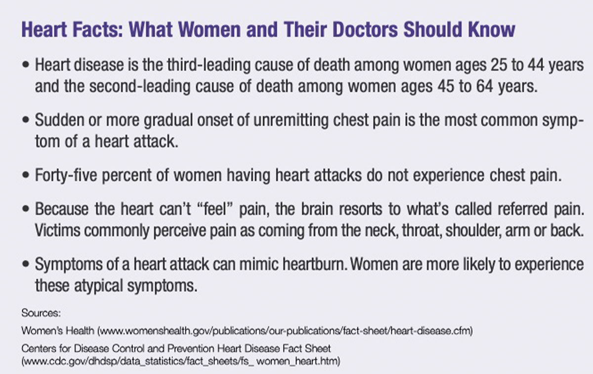 MANY OF US think we’d recognize the symptoms of a heart attack. Movies and television depict heart attack victims clutching their chests, gasping for air and collapsing. The reality for most women heart attack patients, however, is quite different, with symptoms that are less dramatic and consequently downplayed or misdiagnosed. Just ask heart attack survivor Carolyn Thomas.